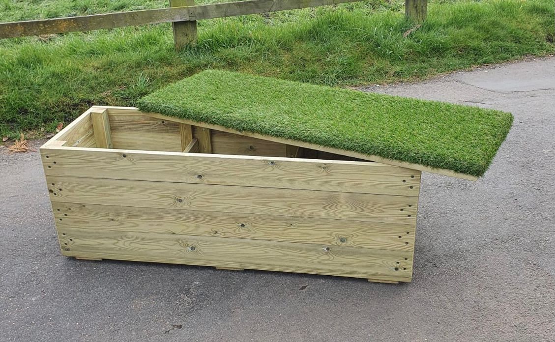 The wooden playground storage seat offers a place to sit with friends whilst providing handy storage for playground equipment.