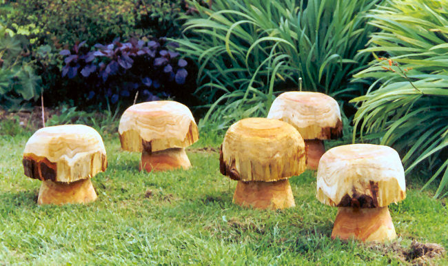 The seats can be left to mature naturally, or oiled to bring out the wonderful grain patterns of the wood. The larger mushrooms are hollowed out to create surprisingly comfortable seating.
