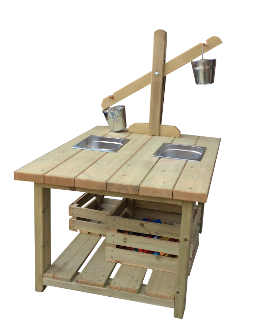 A sturdy table with built in storage trays and fixed balance scales.